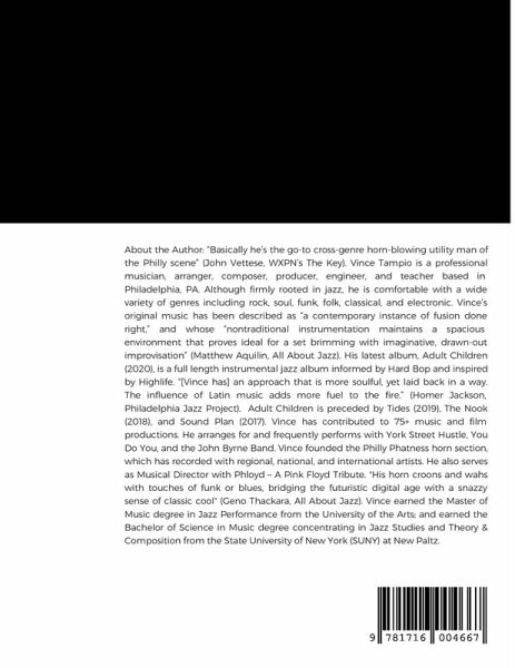 About the Author: "Basically he's the go-to cross-genre horn-blowing utility man of the Philly scene" (John Vettese, WXPN's The Key). Vince Tampio is a professional musician, arranger, composer, producer, engineer, and teacher based in Philadelphia, PA. Although firmly rooted in jazz, he is comfortable with a wide variety of genres including rock, soul, funk, folk, classical, and electronic. Vince's original music has been described as "a contemporary instance of fusion done right," and whose "nontraditional instrumentation maintains a spacious environment that proves ideal for a set brimming with imaginative, drawn-out improvisation" (Matthew Aquilin, All About Jazz). His latest album, Adult Children (2020), is a full length instrumental jazz album informed by Hard Bop and inspired by Highlife. "[Vince has] an approach that is more soulful, yet laid back in a way. The influence of Latin music adds more fuel to the fire." (Homer Jackson, Philadelphia Jazz Project). Adult Children is preceded by Tides (2019), The Nook (2018), and Sound Plan (2017). Vince has contributed to 75+ music and film productions. He arranges for and frequently performs with York Street Hustle, You Do You, and the John Byrne Band. Vince founded the Philly Phatness horn section, which has recorded with regional, national, and international artists. He also serves as Musical Director with Phloyd - A Pink Floyd Tribute. "His horn croons and wahs with touches of funk or blues, bridging the futuristic digital age with a snazzy sense of classic cool" (Geno Thackara, All About Jazz). Vince earned the Master of Music degree in Jazz Performance from the University of the Arts; and earned the Bachelor of Science in Music degree concentrating in Jazz Studies and Theory & Composition from the State University of New York (SUNY) at New Paltz.