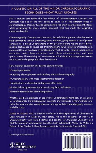 Chromatography is a technique for analyzing or separating mixtures. The first edition of Chromatography: Concepts and Contrasts, published in 1988, was one of the first books to discuss all the different types of chromatography under one cover and is still very popular today. The second edition is updated to include new chapters on sampling and sample preparation, capillary electrophoresis and capillary electrochromatography (CEC), chromatography with mass spec detection, and industrial and governmental practices in regulated industries.The first edition of Chromatography: Concepts and Contrasts, published in 1988, was one of the first books to discuss all the different types of chromatography under one cover. The second edition continues with these principles but has been updated to include new chapters on sampling and sample preparation, capillary electrophoresis and capillary electrochromatography (CEC), chromatography with mass spec detection, and industrial and governmental practices in regulated industries. _ Covers extraction, solid phase extraction (SPE), and solid phase microextraction (SPME), and introduces mass spectrometry. _ Updated with the latest techniques in chromatography. _ Discusses both liquid chromatography (LC) and gas chromatography (GC).