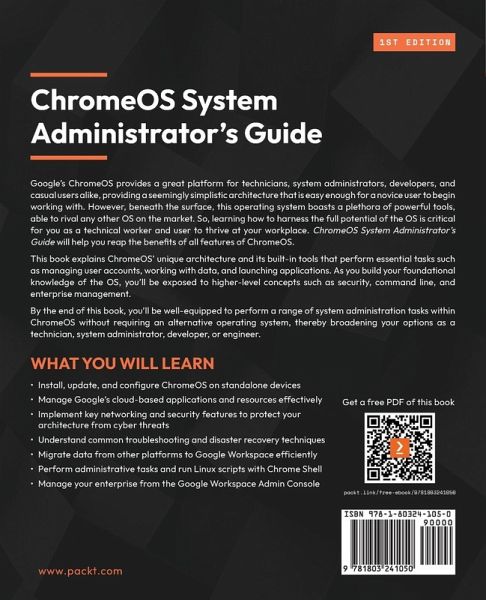 Explore the sysadmin features and architecture of ChromeOS to master its local and cloud-based administrative tools and capabilities Key Features:Get a complete overview of using ChromeOS as a powerful system admin tool Get hands-on experience working with Google's administration platform Learn about centralized management of resources as the hallmark of enterprise system administration Book Description: Google's ChromeOS provides a great platform for technicians, system administrators, developers, and casual users alike, providing a seemingly simplistic architecture that is easy enough for a novice user to begin working with. However, beneath the surface, this operating system boasts a plethora of powerful tools, able to rival any other OS on the market. So, learning how to harness the full potential of the OS is critical for you as a technical worker and user to thrive at your workplace. ChromeOS System Administrator's Guide will help you reap the benefits of all features of ChromeOS. This book explains ChromeOS' unique architecture and its built-in tools that perform essential tasks such as managing user accounts, working with data, and launching applications. As you build your foundational knowledge of the OS, you'll be exposed to higher-level concepts such as security, command line, and enterprise management. By the end of this book, you'll be well-equipped to perform a range of system administration tasks within ChromeOS without requiring an alternative operating system, thereby broadening your options as a technician, system administrator, developer, or engineer. What You Will Learn:Install, update, and configure ChromeOS on standalone devices Manage Google's cloud-based applications and resources effectively Implement key networking and security features to protect your architecture from cyber threats Understand common troubleshooting and disaster recovery techniques Migrate data from other platforms to Google Workspace efficiently Perform administrative tasks and run Linux scripts with Chrome Shell Manage your enterprise from the Google Workspace Admin Console Who this book is for: This book is for you if you want to become a system administrator, developer, or engineer, and are looking to explore ChromeOS architecture all while expanding your knowledge of administration tools and techniques. Basic knowledge of system administration is required.