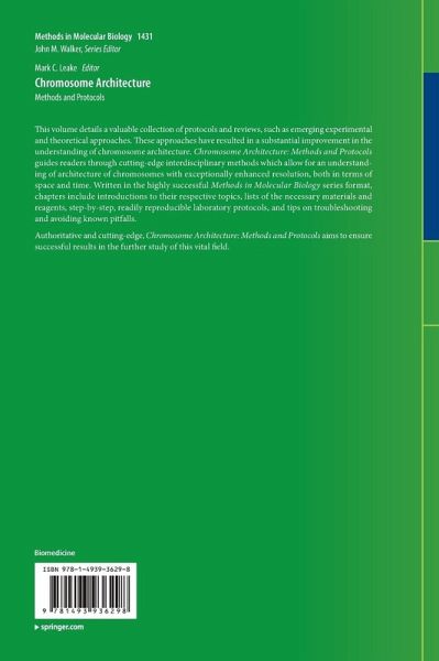 New Advances in Chromosome Architecture.- Single MoleculeNarrowfield Microscopy Of Protein-DNA Binding Dynamics In Glucose SignalTransduction Of Live Yeast Cells.- Single-Molecule Imaging to Characterise the TransportMechanism of the Nuclear Pore Complex.- Using Fluorescence Recovery after Photobleaching (FRAP)To Study Dynamics Of The Structural Maintenance Of Chromosome (SMC) Complex InVivo.- Imaging DNA Structure by Atomic Force Microscopy.- Investigating Bacterial ChromosomeArchitecture Using Epifluorescence Microscopy.- Transverse Magnetic TweezersAllowing Coincident Epi-Fluorescence Microscopy On Horizontally Extended DNA.- Probing Chromosome Dynamics in Bacillus Subtilis.- Systems Biology Approaches for Understanding Genome Architecture.- InVivo And In Situ Replication Labeling Methods For Super-ResolutionStructured Illumination Microscopy Of Chromosome Territories And ChromatinDomains.- DNA-Protein InteractionsStudied Directly Using Single Molecule Fluorescence Imaging Of Quantum DotTagged Proteins Moving On DNA Tightropes.- Escherichia Coli Chromosome CopyNumber Measurement Using Flow Cytometry Analysis.- Bacterial Chromosome Dynamics by Locus Tracking In FluorescenceMicroscopy.- Biophysical Characterization of Chromatin Remodelling Protein CHD4.- Atomistic MolecularDynamics Simulations of DNA Minicircle Topoisomers: A Practical Guide to Setup,Performance and Analysis.- Super-Resolution Microscopy and Tracking of DNA-Binding Proteins in Bacterial Cells.- Studying the Dynamics of Chromatin Binding Proteins in Mammalian CellsUsing Single-Molecule Localization Microscopy.- IntraNuclear Single Particle Tracking (I-SPT) To Reveal the Functional Architecture OfChromosomes.- Visualizing Bacillus Subtilis during Vegetative Growth and Spore Formation.