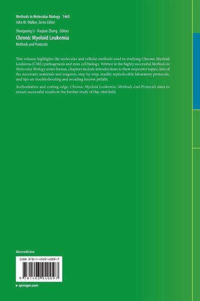 Molecular Detection of BCR-ABL in Chronic Myeloid Leukemia.- Induction of Chronic Myeloid Leukemia in Mice.- CML Mouse Model Generated from Leukemia Stem Cells.- Immunological Analyses of Leukemia Stem Cells.- Cell Cycle Analysis of CML Stem Cells using Hoechst33342 and Propidium Iodide.- Histological and In Vivo Microscopic Analysis of the Bone Marrow Microenvironment in a Murine Model of Chronic Myelogenous Leukemia.- The Culture Repopulation Ability (CRA) Assay and Incubation in Low Oxygen to Test Anti-Leukemic Drugs on Imatinib-resistant CML Stem-like Cells.- Tumor Suppressor Analysis in CML.- Detecting Autophagy and Autophagy Flux in Chronic Myeloid Leukemia Cells Using a Cyto ID Fluorescence Spectrophotometric Assay.- DREAM, A Simple Method for DNA Methylation Profiling by High Throughput Sequencing.- ChIP-seq Analysis of Human Chronic Myeloid Leukemia Cells.- Quantitative Proteomics Analysis of Leukemia Cells.- A Convenient Cell Culture Model for CML Acquired Resistance through BCR-ABL Mutations.- High Throughput Screening of Tyrosine Kinase Inhibitor Resistant Genes in CML.- Biological Analysis of Human CML Stem Cells; Xenograft Model of Chronic Phase Human Chronic Myeloid Leukemia.- New Mouse Models to Investigate the Efficacy of Drug Combinations in Human Chronic Myeloid Leukemia.- miRNome Analysis of CML Cells.- An Integrative Analysis of microRNA and mRNA Profiling in CML Stem Cells.- Single Cell Cytokine Profiling to Investigate Cellular Functional Diversity in Hematopoietic Malignancies.