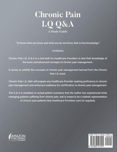 "To know what you know and what you do not know, that is true knowledge." Confucius Chronic Pain I.Q. Q & A is a tool built for Healthcare Providers to test their knowledge of the basic and advanced concepts of chronic pain management. It serves to solidify the concepts of chronic pain management learned from the Chronic Pain I.Q. book. Chronic Pain I.Q. Q&A will prepare any Healthcare Provider seeking proficiency in chronic pain management and enhances readiness for certification in chronic pain management. The Q & A is modeled on actual patient scenarios that the author has experienced while managing patients suffering from chronic pain, and is meant to be a realistic representation of chronic pain patients that Healthcare Providers care for regularly
