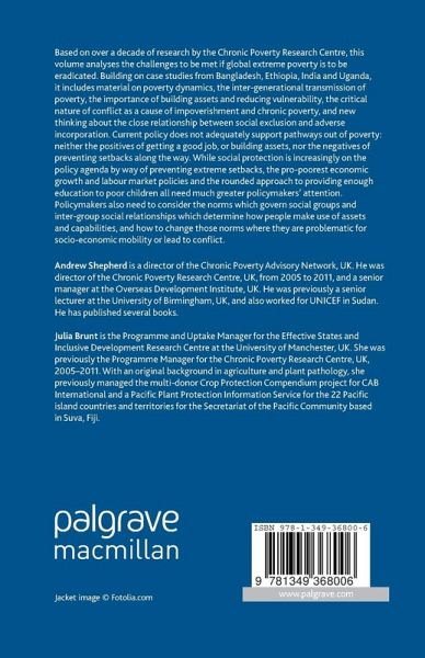 1. Introduction; Karen Moore & Julia Brunt 2. An Evolving Framework for Understanding Chronic Poverty; Andrew Shepherd 3. Understanding Poverty Dynamics and Economic Mobility; Bob Baulch 4. The Intergenerational Transmission of Poverty: An Overview; Kate Bird 5. Does Vulnerability Create Poverty Traps?; Armando Barrientos 6. Assets and Chronic Poverty; Andy McKay 7. Adverse-incorporation, Social Exclusion and Chronic Poverty; Sam Hickey & Andries du Toit 8. Violent Conflict and Chronic Poverty; Tony Addison, Kathryn Bach & Tim Braunholtz-Speight 9. Low Accumulation, High Vulnerability and Greater Exclusions: Why the Chronically Poor Cannot Escape Poverty in Bangladesh, or Elsewhere in South Asia; Binayak Sen & Zulfiqar Ali 10 . Understanding Youth Life-course Poverty in Ethiopia; Yisak Tafere 11 . Policies to Address Chronic Poverty in India; Aasha Kapur Mehta, Amita Shah, Trishna Satpathy, Shashanka Bhide & Anand Kumar 12. Chronic Poverty in Uganda: Issues and Policy Options; Charles Lwanga-Ntale 13. Conclusion; Andrew Shepherd