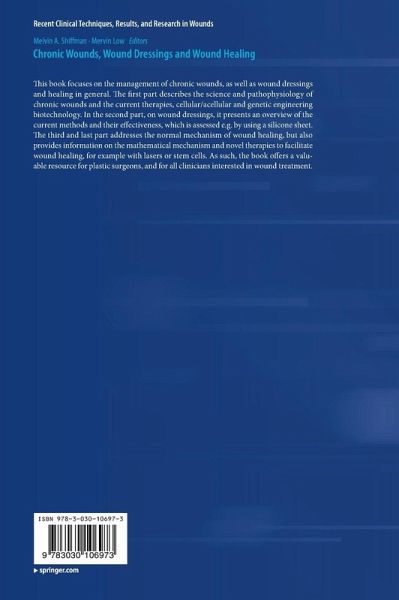 Part 1: Chronic Wounds.- Impact of Host Defence Peptides on Chronic Wounds and Infections.- Low-Level Laser Therapy (LLLT) in Wound Healing.- Biologic Tools for Genetic Engineering Chronic Wounds.- Challenges and Opportunities in Drug Delivery for Wound Healing.- Engineered Biomaterials for Chronic Wound Healing.- Chronic Wounds of the Upper Extremity and their Management.- Marjolin's Ulcer.- Radiation Wounds and their Management: Reconstructive Options.- Co-Opting Developmental Signaling Pathways to Promote Wound Healing.- Segmentation and Management of Chronic Wound Images: A Computer-Based Approach.- Extracellular Matrix and Other Factors that Impact on Cutaneous Scarring.- Part 2: Wound Dressings.- Introduction to Wound Dressings.- Wound Dressings and Comparative Effectiveness Data.- Early Wound Dressing Removal.- Electrospun Antimicrobial Wound Dressings: Novel Strategies to Fight Against Wound Infections.- Cognition and Wound Healing.- Part 3: Wound Healing.- Acute Wound Healing: Normal Mechanisms.- Stem Cell Therapies for Wound Healing.- The Role of miR-205 during Skin Wound Reepithelialization.- Porcine Acellular Lung Matrix in Wound Healing and Hernia Repair.- Wound Healing Problems in the Mouth.- Skin Substitutes in Wound Healing and the Stimulatory Effects of Adipose-Derived Stem Cells for the Proliferation of Keratinocytes on Chitosan.- Why isn't this Wound Healing?.- Traditional and Non-Traditional Evaluation of Wound Healing Process.- Mechanoregulation of Wound Healing and Skin Homeostasis.- Impact of Amnion-Derived Mesenchymal Stem Cells on Wound Healing.- Kinin Receptors in Skin Wound Healing.