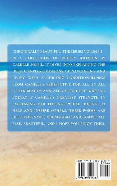 Chronically Beautiful II by Camille Soleil is a poetic journey through resilience, introspection, and finding beauty in the face of chronic illness. Soleil's evocative verses offer readers intimate glimpses into the everyday struggles and hard-won triumphs of navigating a world complicated by health challenges. Through deeply personal reflections on family, friendships, and the search for meaning, Soleil grapples with identity, pain, and strength, revealing the tender complexities of life with unflinching honesty. With poems like Sometimes, The Little, and NF2, Soleil delves into the raw, candid realities of living with chronic illness, all while refusing to be solely defined by it. She writes of moments of vulnerability and profound resilience, skillfully weaving sorrow with hope and honoring the delicate balance between them. Each piece-whether it reflects on the beauty of a spring day, the quiet power of nighttime solitude, or the solace found within life's overlooked wonders-illuminates a universal journey of self-acceptance, fortitude, and love. This collection is for anyone seeking solace in shared experiences, understanding in adversity, and inspiration to recognize beauty in life's complexities. Chronically Beautiful II invites readers to cherish life's "little" moments, hold onto hope even in hardship, and find peace in simply being human. Through Soleil's words, we are reminded of our shared strength and the enduring beauty within us all.