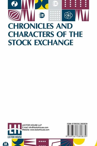 NEW PRINT WITH PROFESSIONAL TYPE-SET IN CONTRAST TO SCANNED PRINTS OFFERED BY OTHERS Chronicles And Characters Of The Stock Exchange This book is a result of an effort made by us towards making a contribution to the preservation and repair of original classic literature. In an attempt to preserve, improve and recreate the original content, we have worked towards: 1. Type-setting & Reformatting: The complete work has been re-designed via professional layout, formatting and type-setting tools to re-create the same edition with rich typography, graphics, high quality images, and table elements, giving our readers the feel of holding a fresh and newly reprinted and/or revised edition, as opposed to other scanned & printed (Optical Character Recognition - OCR) reproductions. 2. Correction of imperfections: As the work was re-created from the scratch, therefore, it was vetted to rectify certain conventional norms with regard to typographical mistakes, hyphenations, punctuations, blurred images, missing content/pages, and/or other related subject matters, upon our consideration. Every attempt was made to rectify the imperfections related to omitted constructs in the original edition via other references. However, a few of such imperfections which could not be rectified due to intentional\unintentional omission of content in the original edition, were inherited and preserved from the original work to maintain the authenticity and construct, relevant to the work.