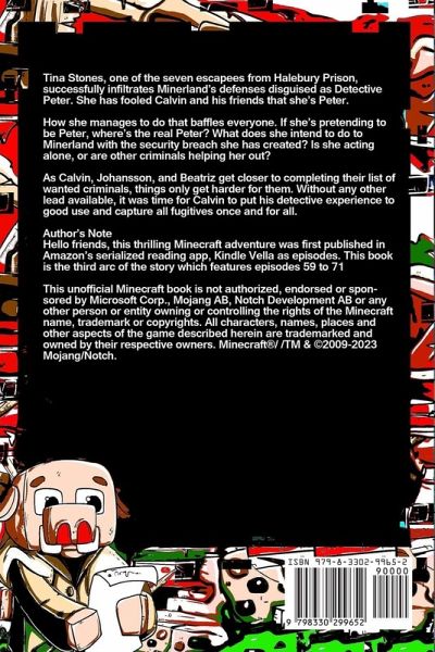 Tina Stones, one of the seven escapees from Halebury Prison, successfully infiltrates Minerland's defenses disguised as Detective Peter. She has fooled Calvin and his friends that she's Peter. How she manages to do that baffles everyone. If she's pretending to be Peter, where's the real Peter? What does she intend to do to Minerland with the security breach she has created? Is she acting alone, or are other criminals helping her out? As Calvin, Johansson, and Beatriz get closer to completing their list of wanted criminals, things only get harder for them. Without any other lead available, it was time for Calvin to put his detective experience to good use and capture all fugitives once and for all. Author's Note: Hello friends, this thrilling Minecraft adventure was first published in Amazon's serialized reading app, Kindle Vella as episodes. This book is the second arc of the story which features episodes 59 to 71 This unofficial Minecraft book is not authorized, endorsed or sponsored by Microsoft Corp., Mojang AB, Notch Development AB or any other person or entity owning or controlling the rights of the Minecraft name, trademark or copyrights. All characters, names, places and other aspects of the game described herein are trademarked and owned by their respective owners. Minecraft(R)/ /TM & (c)2009-2023 Mojang/Notch