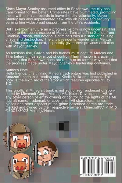 Since Mayor Stanley assumed office in Fakertown, the city has transformed for the better. Crime rates have plummeted, prompting those with criminal records to leave the city voluntarily. Mayor Stanley has also implemented new laws on peace and security, earning him widespread support from the city's residents. But Fakertown's future as a progressive city is now uncertain. This is due to the recent escape of Marcus Tore and Tina Stones from Halebury Prison, two notorious criminals with a history of causing chaos and destruction. The city's residents wonder what Marcus and Tina plan to do next, especially given their previous affiliation with Mayor Stanley. As tensions rise, Calvin and his friends must capture Marcus and Tina before things spiral out of control. Their mission is crucial in ensuring that Fakertown does not return to its former ways and that the progress made under Mayor Stanley's leadership continues. Author's Note Hello friends, this thrilling Minecraft adventure was first published in Amazon's serialized reading app, Kindle Vella as episodes. This book is the sixth arc of the story which features episodes 99 to 112. This unofficial Minecraft book is not authorized, endorsed or sponsored by Microsoft Corp., Mojang AB, Notch Development AB or any other person or entity owning or controlling the rights of the Minecraft name, trademark or copyrights. All characters, names, places and other aspects of the game described herein are trademarked and owned by their respective owners. Minecraft(R)/ /TM & (c)2009-2023 Mojang/Notch