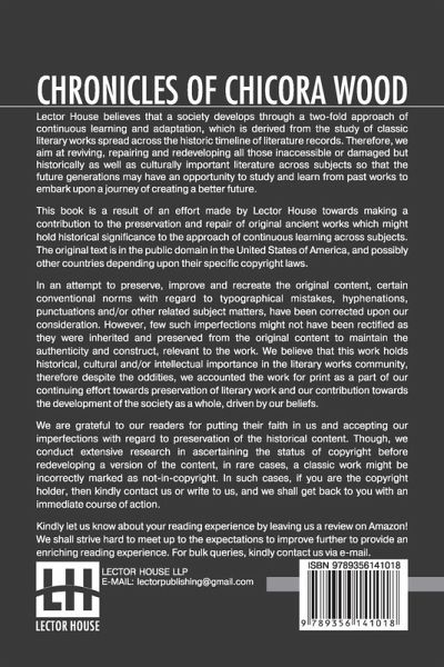 NEW PRINT WITH PROFESSIONAL TYPE-SET IN CONTRAST TO SCANNED PRINTS OFFERED BY OTHERS Chronicles Of Chicora Wood This book is a result of an effort made by us towards making a contribution to the preservation and repair of original classic literature. In an attempt to preserve, improve and recreate the original content, we have worked towards: 1. Type-setting & Reformatting: The complete work has been re-designed via professional layout, formatting and type-setting tools to re-create the same edition with rich typography, graphics, high quality images, and table elements, giving our readers the feel of holding a 'fresh and newly' reprinted and/or revised edition, as opposed to other scanned & printed (Optical Character Recognition - OCR) reproductions. 2. Correction of imperfections: As the work was re-created from the scratch, therefore, it was vetted to rectify certain conventional norms with regard to typographical mistakes, hyphenations, punctuations, blurred images, missing content/pages, and/or other related subject matters, upon our consideration. Every attempt was made to rectify the imperfections related to omitted constructs in the original edition via other references. However, a few of such imperfections which could not be rectified due to intentional\unintentional omission of content in the original edition, were inherited and preserved from the original work to maintain the authenticity and construct, relevant to the work. We believe that this work holds historical, cultural and/or intellectual importance in the literary works community, therefore despite the oddities, we accounted the work for print as a part of our continuing effort towards preservation of literary work and our contribution towards the development of the society as a whole, driven by our beliefs. We are grateful to our readers for putting their faith in us and accepting our imperfections with regard to preservation of the historical content. HAPPY READING!