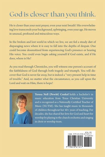 God is closer than you think. He is closer than your next prayer, even your next breath! His overwhelming love transcends your background, upbringing, even your age. He moves in unusual, profound and miraculous ways. In the broken and lost world in which we live, we are fed a steady diet of disparaging news where it is easy to fall into the depths of despair. One could become desensitized from experiencing God's presence or hearing His voice. You could even begin asking yourself if God exists, and if He does, where is He? As you read through Chronicles, you will witness one person's account of the faithfulness of God through both tragedy and triumph. You will discover that God is never far away, but is indeed a "very present help in time of trouble." And, no matter what the circumstance, as you call upon the Lord and wait on Him, there is hope!