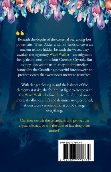 Beneath the depths of the Celestial Sea, a long-lost power stirs. When Aiden and his friends uncover an ancient temple hidden beneath the waves, they awaken the legendary Wave Walker-an enigmatic being tied to one of the four Creation Crystals. But as they unravel the truth, they find themselves hunted by the Guardians, powerful forces sworn to protect secrets that were never meant to resurface. With danger closing in and the balance of the elements at stake, the four must fight to escape with the Wave Walker before the truth is buried once more. As alliances shift and destinies are questioned, Aiden faces a revelation that could change everything. Can they outwit the Guardians and protect the crystal's legacy, or will the tides of fate drag them under?'