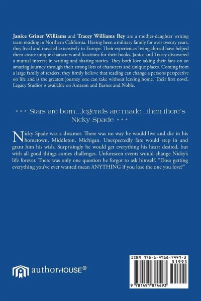 Stars are born...legends are made...then there's Nicky Spade. Nicky Spade was a dreamer. There was no way he would live and die in his hometown, Middleton, Michigan. Unexpectedly fate would step in and grant him his wish. Surprisingly he would get everything his heart desired, but with all good things comes challenges. Unforeseen events would change Nicky's life forever. The only question he forgot to ask himself was, "Does getting everything you've ever wanted mean ANYTHING if you lose the one you love?"