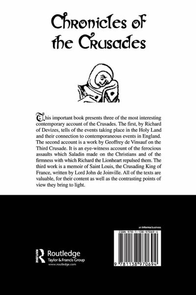 First published in 2006. This important book presents three of the most interesting contemporary accounts of the Crusades. The first, by Richard of Devizes, tells us of events taking place in the Holy Land and their connection to contemporaneous events in England. The second account is work by Geoffrey de Vinsauf on the Third Crusade. It is an eye-witness account of the ferocious assaults which Saladin made on the Christians and of the firmness with which Richard the Lionheart repulsed them. The third work is a memoir of Saint Louis, the Crusading King of France, written by Lord John de Joinville. All of the texts are valuable for their content as well as contrasting points of view they bring to light.