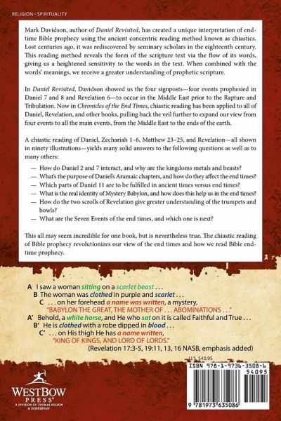 Mark Davidson, author of Daniel Revisited, has created a unique interpretation of end-time Bible prophecy using the ancient concentric reading method known as chiastics. Lost centuries ago, it was rediscovered by seminary scholars in the eighteenth century. This reading method reveals the form of the scripture text via the flow of its words, giving us a heightened sensitivity to the words in the text. When combined with the words' meanings, we receive a greater understanding of prophetic scripture. In Daniel Revisited, Davidson showed us the four signposts-four events prophesied in Daniel 7 and 8 and Revelation 6-to occur in the Middle East prior to the Rapture and Tribulation. Now in Chronicles of the End Times, chiastic reading has been applied to all of Daniel, Revelation, and other books, pulling back the veil further to expand our view from four events to all the main events, from the Middle East to the ends of the earth. A chiastic reading of Daniel, Zechariah 1-6, Matthew 23-25, and Revelation-all shown in ninety illustrations-yields many solid answers to the following questions as well as to many others: - How do Daniel 2 and 7 interact, and why are the kingdoms metals and beasts? - What's the purpose of Daniel's Aramaic chapters, and how do they affect the end times? - Which parts of Daniel 11 are to be fulfilled in ancient times versus end times? - What is the real identity of Mystery Babylon, and how does this help us in the end times? - How do the two scrolls of Revelation give greater understanding of the trumpets and bowls? - What are the Seven Events of the end times, and which one is next? This all may seem incredible for one book, but is nevertheless true. The chiastic reading of Bible prophecy revolutionizes our view of the end times and how we read Bible end-time prophecy.