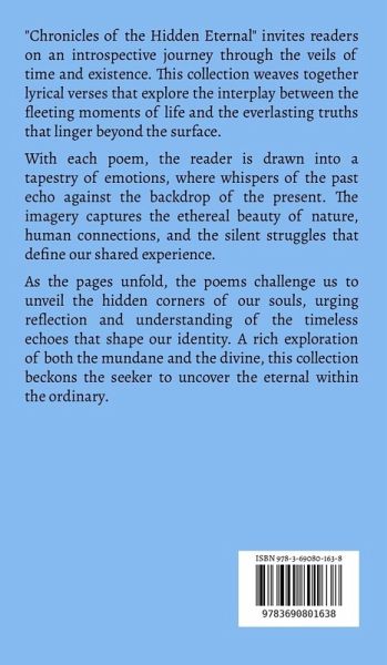 "Chronicles of the Hidden Eternal" invites readers on an introspective journey through the veils of time and existence. This collection weaves together lyrical verses that explore the interplay between the fleeting moments of life and the everlasting truths that linger beyond the surface. With each poem, the reader is drawn into a tapestry of emotions, where whispers of the past echo against the backdrop of the present. The imagery captures the ethereal beauty of nature, human connections, and the silent struggles that define our shared experience. As the pages unfold, the poems challenge us to unveil the hidden corners of our souls, urging reflection and understanding of the timeless echoes that shape our identity. A rich exploration of both the mundane and the divine, this collection beckons the seeker to uncover the eternal within the ordinary.