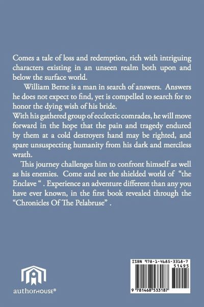 Comes a tale of loss and redemption, rich with intriguing characters existing in an unseen realm both upon and below the surface world. William Berne is a man in search of answers. Answers he does not expect to find, yet is compelled to search for to honor the dying wish of his bride. With his gathered group of ecclectic comrades , he will move forward in the hope that the pain and tragedy endured by them at a cold destroyers hand may be righted , and spare unsuspecting humanity from his dark and merciless wrath . This journey challenges him to confront himself as well as his enemies . Come and see the shielded world of " the Enclave " . Experience an adventure different than any you have ever known , in the first book revealed through the "Chronicles Of The Pelabruse " .