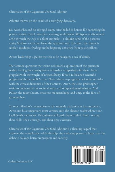 Chronicles of the Quantum Veil (2nd Edition) Atlantis thrives on the brink of a terrifying discovery. Dr. Aeon Flux and his intrepid team, once hailed as heroes for harnessing the power of time travel, now face a resurgent darkness. Whispers of discontent echo through the city as a faint anomaly - a chilling echo of the parasitic entity Shadow - emerges from the quantum veil. This time, the threat is subtler, insidious, feeding on the lingering anxieties from past conflicts. Aeon's leadership is put to the test as he navigates a sea of doubt. The Council questions the team's continued exploration of the quantum realm, fearing the consequences of further tampering with time. Aeon grapples with the weight of responsibility, forced to balance scientific progress with the public's trust. Nova, the ever-pragmatic scientist, wrestles with the ethical dilemmas of their actions. Orion, the stoic philosopher, seeks to understand the societal impact of temporal manipulation. And Pulsar, the team's heart, strives to maintain hope and unity in the face of growing fear. United once more, they embark on a perilous mission into the heart of the quantum veil. To sever Shadow's connection to the anomaly and prevent its resurgence, Aeon and his companions must venture into the chaotic realm where time itself bends and twists. This mission will push them to their limits, testing their skills, their courage, and their very existence. Chronicles of the Quantum Veil (2nd Edition) is a thrilling sequel that explores the complexities of leadership, the enduring power of hope, and the delicate balance between progress and security.