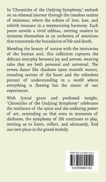 In "Chronicles of the Undying Symphony," embark on an ethereal journey through the timeless realms of existence, where the echoes of love, loss, and rebirth resonate in a mesmerizing harmony. Each poem unveils a vivid tableau, inviting readers to immerse themselves in an orchestra of emotions that transcends the boundaries of life and death. Blending the beauty of nature with the intricacies of the human soul, this collection captures the delicate interplay between joy and sorrow, weaving tales that are both personal and universal. The verses dance like shadows upon moonlit waters, revealing secrets of the heart and the relentless pursuit of understanding in a world where everything is fleeting but the music of our experiences. With lyrical grace and profound insight, "Chronicles of the Undying Symphony" celebrates the resilience of the spirit and the enduring power of art, reminding us that even in moments of darkness, the symphony of life continues to play, inviting us to listen, reflect, and ultimately, find our own place in the grand melody.