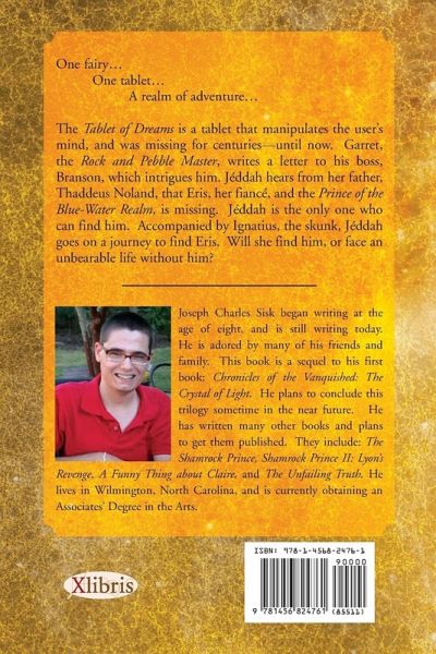 One fairy¿ One tablet¿ A realm of adventure¿ The Tablet of Dreams is a tablet that manipulates the user's mind, and was missing for centuries¿until now. Garret, the Rock and Pebble Master, writes a letter to his boss, Branson, which intrigues him. Jeddah hears from her father, Thaddeus Noland, that Eris, her fiance, and the Prince of the Blue-Water Realm, is missing. Jeddah is the only one who can find him. Accompanied by Ignatius, the skunk, Jeddah goes on a journey to find Eris. Will she find him, or face an unbearable life without him?