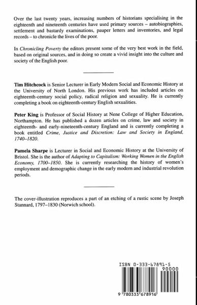 List of Tables and Figures List of Abbreviations Notes on the Contributors Introduction Going on the Parish: the Parish Pension and Its Meaning in the London Suburbs 1640-1724; J.Boulton London Domestic Servants from Depositional Evidence, 1660-1750: Servant-Employer Sexuality in the Patriarchal Household; T.Meldrum 'Unlawfully Begotten on Her Body': Illegitimacy and the Parish Poor in St Luke's, Chelsea; T.Hitchcock 'The Bowels of Compation': a Labouring Family and the Law c.1790-1834; P.Sharpe Voices in the Crowd: the Kirby Lonsdale Township Letters 1809-36; J.S.Taylor Old Age in Poverty: the Record of Essex Pauper Letters 1780-1834; T.Sokoll Pauper Inventories and the Material Life of the Poor in the Eighteenth and Early Nineteenth Centuries; P.King 'An Old Offender tho' so Young in Years': the Criminal Careers of Juvenile Offenders in Middlesex in the 1830s; H.Shore 'The Poor in Blindnes': Letters from Mildenhall, Wilts 1835-6; G.C.Smith Index