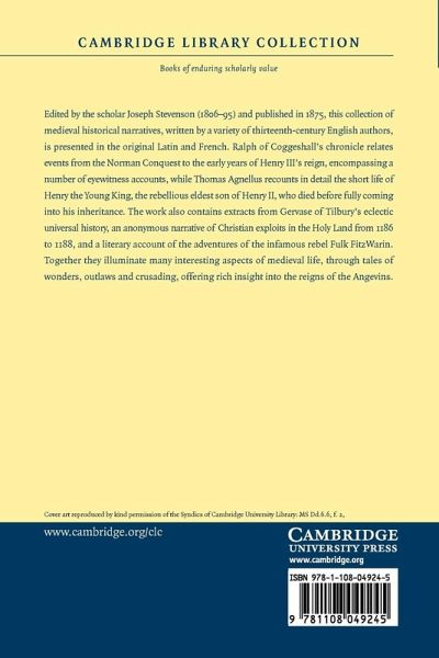 Edited by the scholar Joseph Stevenson (1806-95) and published in 1875, this collection of medieval historical narratives, written by a variety of thirteenth-century English authors, is presented in the original Latin and French. Ralph of Coggeshall's chronicle relates events from the Norman Conquest to the early years of Henry III's reign, encompassing a number of eyewitness accounts, while Thomas Agnellus recounts in detail the short life of King Henry Junior, the rebellious eldest son of Henry II, who died before fully coming into his inheritance. The work also contains extracts from Gervase of Tilbury's eclectic universal history, an anonymous narrative of Christian exploits in the Holy Land from 1186 to 1188, and a literary account of the adventures of the infamous rebel Fulk FitzWarin. Together they illuminate many interesting aspects of medieval life, through tales of wonders, outlaws and crusading, offering rich insight into the reigns of the Angevins.