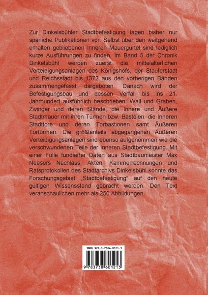 Im Band 5 der Chronik Dinkelsbühl werden die mittelalterlichen Verteidigungsanlagen der Frühzeit bis 1372 zusammengefasst, danach die Entwicklung der Stadtbefestigung bis in die Gegenwart beschrieben: Wall und Graben, die Zwinger und deren Stände, die Innere und Äußere Stadtmauer mit ihren Türmen bzw. Basteien, die Inneren Stadttore und deren Torbastionen samt Äußeren Tortürmen. Die größtenteils abgegangenen Äußeren Verteidigungsanlagen sind ebenso aufgenommen wie die verschwundenen Teile der Inneren Stadtbefestigung. Mit einer Fülle fundierter Daten und neuer Erkenntnisse sowie über 250 Abbildungen der heute gültige Wissensstand über die einstige Reichsstadt Dinkelsbühl.