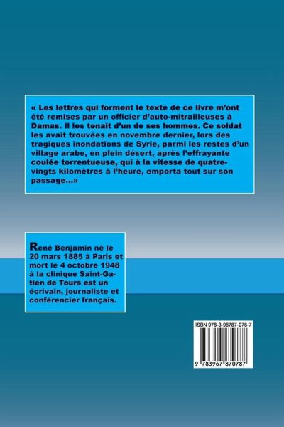 « Les lettres qui forment le texte de ce livre m’ont été remises par un officier d’auto-mitrailleuses à Damas. Il les tenait d’un de ses hommes. Ce soldat les avait trouvées en novembre dernier, lors des tragiques inondations de Syrie, parmi les restes d’un village arabe, en plein désert, après l’effrayante coulée torrentueuse, qui à la vitesse de quatre-vingts kilomètres à l’heure, emporta tout sur son passage...»