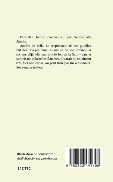 Peut-être faut-il commencer par Sainte-Folle Agathe.Agathe est belle. Le crépitement de ses pupilles fait des ravages dans les ruelles de son enfance. A six ans déjà, elle cabriole le feu de la Saint-Jean, et son visage éclaire les flammes. Il parait qu'en aimant très fort une chose, on peut finir par lui ressembler. Ses yeux grésillent.