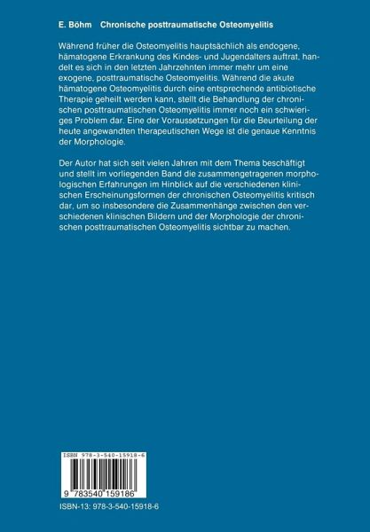 1 Einleitung.- 2 Fragestellung.- 3 Patientengut.- 4 Untersuchungsmethoden.- 5 Morphologische Grunderscheinungsformen der posttraumatischen Osteomyelitis (einschließlich angiologischer Befunde).- 5.1 Akute Osteomyelitis.- 5.2 Chronische Osteomyelitis.- 5.2.1 Histologischer Aufbau der chronischen posttraumatischen Knochenentzündung.- 5.2.2 Feingewebliche Einteilung der chronischen posttraumatischen Osteomyelitis.- 5.23 Angiologische Befunde.- 6 Bedeutung der Einteilung der posttraumatischen Osteomyelitis nach histologischen Kriterien für die Beurteilung des Verlaufs.- 7 Systematische Darstellung der Morphologie der Sonderformen, der Komplikationen sowie der lokalen Behandlungsfolgen der posttraumatischen Knocheninfektion.- 7.1 Mikroskopische und makroskopische Sonderformen.- 7.1.1 Plasmazelluläre Osteomyelitis.- 7.1.2 Bohrlochosteomyelitis.- 7.1.3 Knocheninfektion im Zusammenhang mit der Verbundosteosynthese.- 7.1.4 Amputationsstumpfosteomyelitis.- 7.1.5 Tumorförmige Osteomyelitis.- 7.1.6 Posttraumatische Knocheninfektion im Zusammenhang mit der Osteochondrodysplasie.- 7.2 Komplikationen der chronischen posttraumatischen Osteomyelitis.- 7.2.1 Lokale Komplikationen.- 7.2.2 Allgemeine Komplikationen.- 7.3 Lokal behandelte chronische posttraumatische Osteomyelitis.- 7.3.1 Gentamycin-PMMA-Kugeln.- 7.3.2 Eigenblutantibiotikaplombe .- 7.3.3 Spongiosatransplantation.- 7.3.4 Spalthauttransplantation.- 8 Ursachen der Chronizität der posttraumatischen Osteomyelitis.- 8.1 Statistische Untersuchungen.- 8.1.1 Aufschlüsselung des Untersuchungsgutes von 355 Patienten mit chronischer posttraumatischer Osteomyelitis.- 8.1.2 Statistische Häufigkeitsuntersuchungen verschiedener klinischer, pathologisch-anatomischer und bakteriologischer Parameter.- 8.2 Morphologische Untersuchungen.- 8.2.1 Histologische Befunde.- 8.2.2 Angiologische Befunde.- 9 Diskussion der eigenen Befunde.- 9.1 Möglichkeiten und Grenzen von bioptischen Untersuchungen bei posttraumatischer Osteomyelitis in der Humanpathologie.- 9.2 Histologische Einteilung der chronischen posttraumatischen Knocheninfektion und ihre Bedeutung im Rahmen von Verlaufsbeobachtungen.- 9.3 Statistische Untersuchungen.- 9.3.1 Aufschlüsselung der eigenen 355 Fälle mit chronischer posttraumatischer Osteomyelitis.- 9.3.2 Gegenüberstellung der klinischen, pathologisch-anatomischen und bakteriologischen Parameter und ihre Beziehung zum histologischen Verlauf der chronischen posttraumatischen Osteomyelitis.- 9.4 Morphologische und angiologische Untersuchungen.- 10 Zusammenfassung der Ergebnisse.