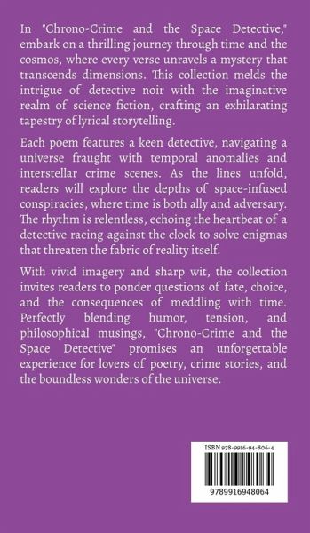 In "Chrono-Crime and the Space Detective," embark on a thrilling journey through time and the cosmos, where every verse unravels a mystery that transcends dimensions. This collection melds the intrigue of detective noir with the imaginative realm of science fiction, crafting an exhilarating tapestry of lyrical storytelling. Each poem features a keen detective, navigating a universe fraught with temporal anomalies and interstellar crime scenes. As the lines unfold, readers will explore the depths of space-infused conspiracies, where time is both ally and adversary. The rhythm is relentless, echoing the heartbeat of a detective racing against the clock to solve enigmas that threaten the fabric of reality itself. With vivid imagery and sharp wit, the collection invites readers to ponder questions of fate, choice, and the consequences of meddling with time. Perfectly blending humor, tension, and philosophical musings, "Chrono-Crime and the Space Detective" promises an unforgettable experience for lovers of poetry, crime stories, and the boundless wonders of the universe.