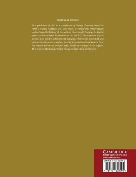 First published in 1882 as a translation by George Chawner from Carl Peter's original German text, this series of concurrent chronological tables charts the history of the ancient Greek world from mythological events to the conquest by the Romans in 146 BC. The timelines record artistic and literary achievement alongside prominent historical and military developments, and are heavily footnoted with quotations from the original sources in ancient Greek, as well as commentary in English. This book will be indispensable to any student of ancient Greece.