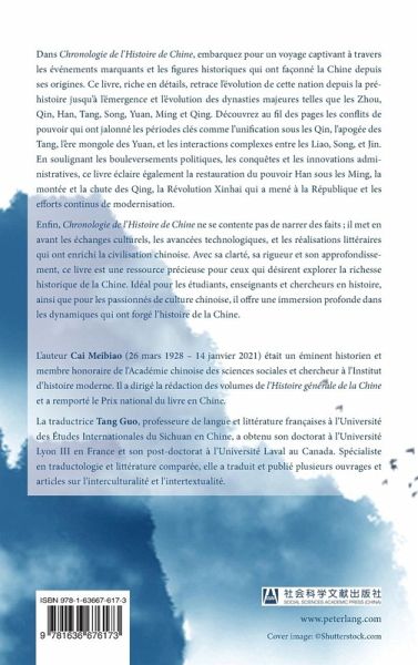L'auteur Cai Meibiao (26 mars 1928 - 14 janvier 2021) était un éminent historien et membre honoraire de l'Académie chinoise des sciences sociales et chercheur à l'Institut d'histoire moderne. Il a dirigé la rédaction des volumes de l'Histoire générale de la Chine et a remporté le Prix national du livre en Chine. La traductrice Tang Guo , professeure de langue et littérature françaises à l'Université des Études Internationales du Sichuan en Chine, a obtenu son doctorat à l'Université Lyon III en France et son post-doctorat à l'Université Laval au Canada. Spécialiste en traductologie et littérature comparée, elle a traduit et publié plusieurs ouvrages et articles sur l'interculturalité et l'intertextualité.