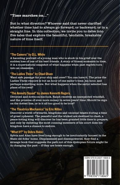 "Time marches on..."But in what direction? Whoever said that never clarified whether time had to always go forward, or backward, or in a straight line. In this collection, we invite you to delve into five tales that explore the beautiful, bendable, breakable nature of time itself."The Camera" by D.L. White: A haunting portrait of a young man who is stuck in his grief over the sudden loss of one of his best friends. A story of frozen moments in time, it is a supernatural snapshot of what happens when past regrets turn into an obsession."The Ladies Three" by Chad Olson: Want safe passage for your ship and crew? You can have it. The price the Ladies Three require is but an hour of one sailor's time. An hour, and perhaps something more. But what happens when the sailor selected has plans of his own?"The Annuity Squad" by James Kenneth Rogers: Divorced and down-on-his-luck, Ralph receives an unexpected windfall, and the promise of even more money in seven years' time. Should he sign on the dotted line, or is it all too good to be true?"The Theatrica Mechanica" by Eric Nilles: Discover a world of wizards, kingdoms and unusual beasts during a time of great upheaval. The peaceful and the wicked are destined to clash, a peace-loving king will discover he has been granted little time to prepare, and only by enlisting the most cunning members of his court does his kingdom have a chance to endure."What If?" by Debra Robic: Sylvia and Alan have lived long enough to be involuntarily housed in the State old folks' home. Dispossessed and disempowered, they find a strange book that suggests the path out of this dystopian future might lie in changing the past - if they are brave enough.