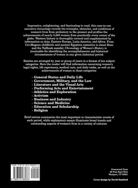 Impressive, enlightening, and fascinating to read, this easy-to-use narrative chronology records the triumphs, obstacles, and conditions of women's lives from prehistory to the present and profiles the achievements of nearly 5,000 women from practically every corner of the globe. Western history is thoroughly covered and supplemented by information on Asia, Eastern Europe, Latin America, and Africa. From Cro-Magnon childbirth and ancient Egyptian cosmetics to Janet Reno and the Tailhook scandal, the breadth, diversity, and accessibility of this work make it invaluable for identifying the accomplishments and circumstances of women in any given historical period. Entries are arranged by year or group of years in an easy-to-use format of ten subject categories. Here the reader will find information concerning women's legal rights, life expectancy, medical care, and daily tasks, as well as the achievements of thousands of individual women in politics, warfare, jurisprudence, literature, the visual and performing arts, athletics, exploration, activism, business, science, scholarship, and religion. Women have had to overcome major obstacles throughout human history and they have accomplished much despite those barriers. This work contains many thousands of testimonies to their achievements. Brief entries summarize the most important or characteristic events of each period, while explanatory essays illuminate broad trends and unusual aspects of women's lives in a variety of cultures. Information can be located easily by consulting the topic and name index, and a bibliography is also included.