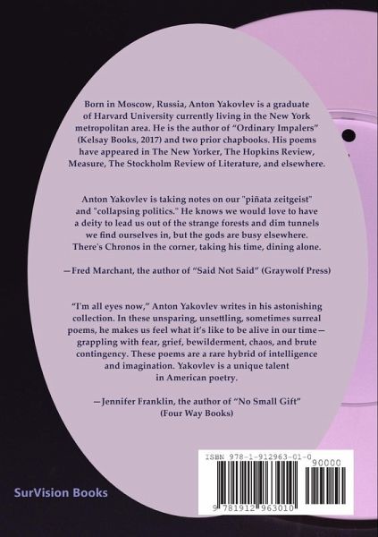 Born in Moscow, Russia, Anton Yakovlev is a graduate of Harvard University currently living in the New York metropolitan area. He is the author of "Ordinary Impalers" (Kelsay Books, 2017) and two prior chapbooks. His poems have appeared in The New Yorker, The Hopkins Review, Measure, The Stockholm Review of Literature, and elsewhere. "In these unsparing, unsettling, sometimes surreal poems, he makes us feel what it's like to be alive in our time-grappling with fear, grief, bewilderment, chaos, and brute contingency. These poems are a rare hybrid of intelligence and imagination. Yakovlev is a unique talent in American poetry," writes Jennifer Franklin, the author of "No Small Gift" (Four Way Books.)