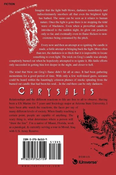 Imagine that the light bulb blows, darkness immediately and indiscriminately smothers all that even the brightest light has bathed. The same can be seen as it relates to human nature. Once the light is gone there is no stopping the tidal wave of blackness. Even when a proverbial candle is introduced to the sudden night, its glow can penetrate only so far, and eventually even its flame flickers to non-existence being consumed by the pitch. Every now and then an attempt at re-igniting the candle is made, a futile attempt at bringing back the light. More often than not, the darkness is so thick that it is impossible to locate something to even light. The wick on Greg's candle was already completely burned out when he hopelessly attempted to re-ignite it. His futile efforts only succeeded in getting him lost deeper in the night, and closer to hell. The wind that blew out Greg's flame didn't hit all at once. It had been gathering momentum for a good period of time. With only a few well-timed gusts, screams could be heard within the hauntingly crimson plumes of smoke spiraling from the burned out candle that had been his soul.In the end there can be only darkness.