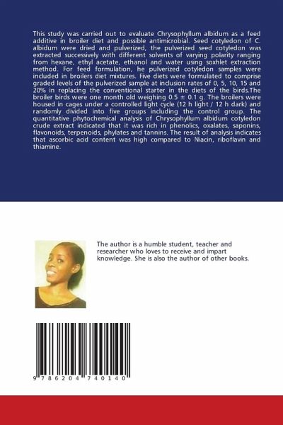 This study was carried out to evaluate Chrysophyllum albidum as a feed additive in broiler diet and possible antimicrobial. Seed cotyledon of C. albidum were dried and pulverized, the pulverized seed cotyledon was extracted successively with different solvents of varying polarity ranging from hexane, ethyl acetate, ethanol and water using soxhlet extraction method. For feed formulation, he pulverized cotyledon samples were included in broilers diet mixtures. Five diets were formulated to comprise graded levels of the pulverized sample at inclusion rates of 0, 5, 10, 15 and 20% in replacing the conventional starter in the diets of the birds.The broiler birds were one month old weighing 0.5 ± 0.1 g. The broilers were housed in cages under a controlled light cycle (12 h light / 12 h dark) and randomly divided into five groups including the control group. The quantitative phytochemical analysis of Chrysophyllum albidum cotyledon crude extract indicated that it was rich in phenolics, oxalates, saponins, flavonoids, terpenoids, phylates and tannins. The result of analysis indicates that ascorbic acid content was high compared to Niacin, riboflavin and thiamine.