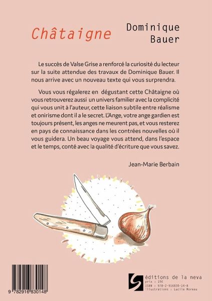 Le succès de Valse grise a renforcé la curiosité du lecteur sur la suite attendue des travaux de Dominique Bauer. Il nous arrive avec un nouveau texte qui vous surprendra. Vous vous régalerez en dégustant cette Châtaigne où vous retrouverez aussi un univers familier avec la complicité qui vous unit à l'auteur, cette laison subtile entre réalisme et onirisme dont il a le secret. L'Ange, votre ange gardien est toujours présent, les anges ne meurent pas, et vous resterez en pays de connaissance dans les contrées nouvelles où il vous guidera. Un beau voyage vous attend, dans l'espace et le temps, conté avec la qualité d'écriture que vous savez. J.M. Berbain
