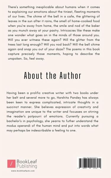 There's something inexplicable about humans when it comes to explaining our emotions about the tiniest, fleeting moments of our lives. The chime of the bell in a cafe, the glittering of leaves in the sun after it rains, the smell of home-cooked food when you're away from home, the smile and nod of the baker as you munch away at your pastry. Intricacies like these make one wonder what goes on in the minds of those around you. Will you ever witness these again? Will the glitter from the trees last long enough? Will you nod back? Will the bell chime again and snap you out of your daze? The poems in this book capture