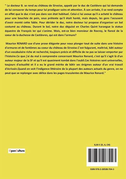 " Le docteur B. se rend au château de Sirvoise, appelé par le duc de Castièvre qui lui demande de lui consacrer du temps pour lui prodiguer soins et attention. À son arrivée, il se rend compte en effet que le duc n'est pas dans son état habituel. Celui-ci lui avoue qu'il a acheté le château pour une bouchée de pain, sous prétexte qu'il était hanté, mais depuis, les gens l'accusent d'avoir monté cette fable. Pour dérider le duc, notre docteur lui propose d'organiser un bal costumé au château. Durant le bal, notre duc déguisé en Charles Quint harangue la statue équestre de François Ier qui s'anime. Mais, est-ce bien monsieur de Rocroy, le fiancé de la soeur de la duchesse de Castièvres, qui est dans l'armure? Maurice RENARD use d'une prose élégante pour nous plonger tout de suite dans une histoire d'armures et de fantômes au coeur du château de Sirvoise.C'est fulgurant, maîtrisé, bâti autour d'un vocabulaire riche et recherché, toujours précis et difficile de ne pas se laisser emporter par l'histoire.Ce que j'ai du mal à comprendre concernant Maurice Renard, c'est qu'il s'agit là d'un auteur majeur de la SF et qu'il est quasiment tombé dans l'oubli.Ces histoires sont universelles, toujours d'actualité et il a eu le grand mérite de bâtir ses énigmes autour d'un vrai travail d'écrivain.Quand on voit l'indigence littéraire de la plupart des auteurs actuels du genre, on ne peut que se replonger avec délice dans les pages truculentes de Maurice Renard."
