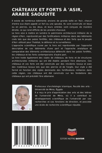 Il existe de nombreux bâtiments anciens de grande taille en 'Asir, chacun d'entre eux étant appelé un fort ou une qasaba. Ils sont construits en boue ou en pierres, ou les deux, et leurs entrées sont conçues de manière étroite, ce qui rend difficile de les prendre d'assaut. Le livre vise à mettre en lumière le patrimoine architectural militaire de la région d'Asir, représenté par des fortifications militaires dans des bâtiments civils tels que des palais fortifiés, des châteaux et des forts que le peuple d'Asir utilisait pour l'habitat, la défense et la surveillance. L'approche scientifique suivie par le livre est représentée par l'approche descriptive de ces bâtiments d'une part et l'approche analytique et comparative des éléments architecturaux défensifs dans les palais fortifiés, les châteaux et les forts contemporains d'autre part.Le livre traite également des styles de châteaux, de forts et de structures architecturales militaires qui ont été établis pendant l'ère ottomane. Ces châteaux et ces forts ont été construits par des résidents locaux et avec des matériaux locaux tels que des pierres et de l'argile, leur style a été formé en fonction des styles dominants des fortifications militaires dans cette région, ces châteaux ont été construits sur les fondations des châteaux qui ont précédé l'ère ottomane.