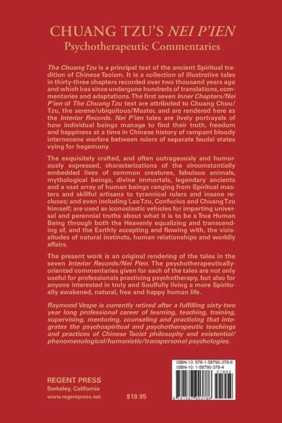 The Chuang Tzu is a principal text of the ancient Spiritual tradition of Chinese Taoism. It is a collection of illustrative tales in thirty-three chapters recorded over two thousand years ago and which has since undergone hundreds of translations, commentaries and adaptations. The first seven Inner Chapters/Nei P’ien of The Chuang Tzu text are attributed to Chuang Chou/Tzu, the serene/ubiquitous/Master, and are rendered here as the Interior Records. Nei P’ien tales are lively portrayals of how individual beings manage to find their truth, freedom and happiness at a time in Chinese history of rampant bloody internecene warfare between rulers of separate feudal states vying for hegemony. The exquisitely crafted, and often outrageously and humorously expressed, characterizations of the circumstantially embedded lives of common creatures, fabulous animals, mythological beings, divine immortals, legendary ancients and a vast array of human beings ranging from Spiritual masters and skillful artisans to tyranical rulers and insane recluses; and even including Lao Tzu, Confucius and Chuang Tzu himself; are used as iconoclastic vehicles for imparting universal and perennial truths about what it is to be a True Human Being through both the Heavenly equalizing and transcending of, and the Earthly accepting and flowing with, the vicissitudes of natural instincts, human relationships and worldly affairs. The present work is an original rendering of the tales in the seven Interior Records/Nei Pien. The psychotherapeutically-oriented commentaries given for each of the tales are not only useful for professionals practicing psychotherapy, but also for anyone interested in truly and Soulfully living a more Spiritually awakened, natural, free and happy human life.