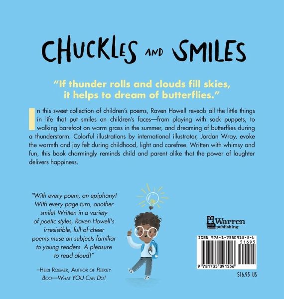 "If thunder rolls and clouds fill skies, it helps to dream of butterflies." In this sweet collection of children's poems, Raven Howell reveals all the little things in life that put smiles on children's faces-from playing with sock puppets, to walking barefoot on warm grass in the summer, and dreaming of butterflies during a thunderstorm. Colorful illustrations by international illustrator, Jordan Wray, evoke the warmth and joy felt during childhood, light and carefree. Written with whimsy and fun, this book charmingly reminds child and parent alike that the power of laughter delivers happiness.