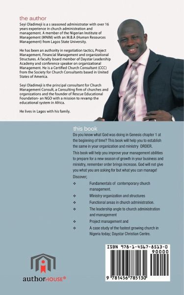 Do you know what God was doing in Genesis chapter 1at the beginning of time?This book will help you to establish the same in your organization and ministry ORDER. This book will help you improve your management abilities to prepare for a new season of growth in your business and ministry, remember order brings increase. God will not give you what you are asking for but what you can manage! Discover: - Fundmentals of contemporary church management. - Ministry organization and structurs. - Functional areas in church administration. - The leadership angle to church administration and management - Project management and -A case study of the fastest growing churh in Nigeria today; Daycare Christian Care