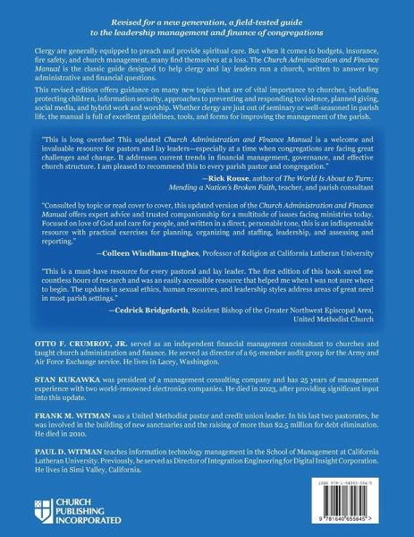 A field-tested guide to the management and finance of church congregations, revised for a new generation. Clergy are generally equipped to preach and provide spiritual care. But when it comes to budgets, insurance, fire safety, and church management many find themselves at a loss. The Church Administration and Finance Manual is the classic guide to running a church, written to answer key questions for clergy and lay leaders. Not simply a theoretical resource, the Manual provides suggestions for almost every aspect of parish administration: position descriptions, financial forms, materials for stewardship and Christian education, building use and safety issues, employee record keeping, and much more. This revised edition offers guidance on many new topics that are of vital importance to churches, including protecting children, information security, approaches to preventing and responding to violence, planned giving, social media, and hybrid work and worship. Whether clergy are just out of seminary or well-seasoned in parish life, the Manual is full of excellent guidelines, tools, and forms for improving the management of the parish.