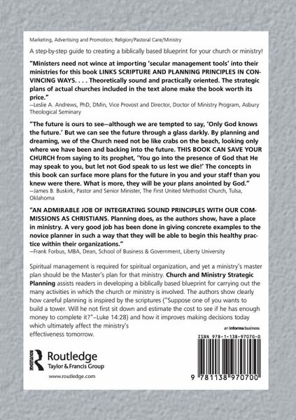 Spiritual management is required for spiritual organization, and yet a ministry's master plan should be the Master's plan for that ministry. Church and Ministry Strategic Planning assists readers in developing a Biblically based blueprint for carrying out the many activities in which the church or ministry is involved. The authors show clearly how careful planning is inspired by the Scriptures (Suppose one of you wants to build a tower. Will he not first sit down and estimate the cost to see if he has enough money to complete it?-Luke 14:28) and how it improves making decisions today which ultimately affect the ministry's effectiveness tomorrow.