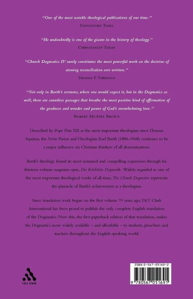 Described by Pope Pius XII as the most important theologian since Thomas Aquinas, the Swiss pastor and theologian, Karl Barth, continues to be a major influence on students, scholars and preachers today. Barth's theology found its expression mainly through his closely reasoned fourteen-part magnum opus, Die Kirchliche Dogmatik. Having taken over 30 years to write, the Church Dogmatics is regarded as one of the most important theological works of all time, and represents the pinnacle of Barth's achievement as a theologian. T&T Clark International is now proud to be publishing the only complete English translation of the Church Dogmatics in paperback.