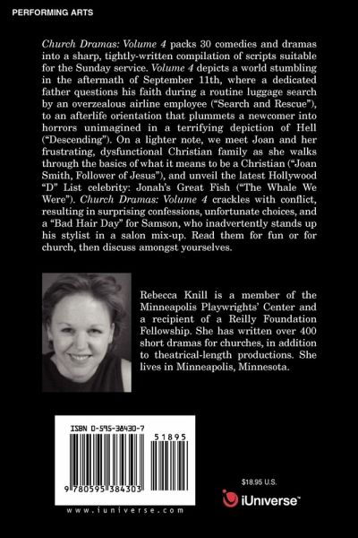 Church Dramas: Volume 4 packs 30 comedies and dramas into a sharp, tightly-written compilation of scripts suitable for the Sunday service. Volume 4 depicts a world stumbling in the aftermath of September 11th, where a dedicated father questions his faith during a routine luggage search by an overzealous airline employee ('Search and Rescue"), to an afterlife orientation that plummets a newcomer into horrors unimagined in a terrifying depiction of Hell ('Descending"). On a lighter note, we meet Joan and her frustrating, dysfunctional Christian family as she walks through the basics of what it means to be a Christian ('Joan Smith, Follower of Jesus"), and unveil the latest Hollywood 'D" List celebrity: Jonah's Great Fish ('The Whale We Were"). Church Dramas: Volume 4 crackles with conflict, resulting in surprising confessions, unfortunate choices, and a 'Bad Hair Day" for Samson, who inadvertently stands up his stylist in a salon mix-up. Read them for fun or for church, then discuss amongst yourselves.