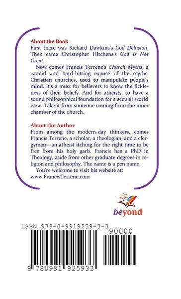 First there was Richard Dawkins's God Delusion. Then came Christopher Hitchens's God Is Not Great. Now comes Francis Terrene's Church Myths, a candid and hard-hitting exposé of the myths Christian churches used to manipulate people's mind. It's a must for believers to know the fickleness of their beliefs. And for atheists, to have a sound philosophical foundation for a secular worldview. Take it from someone coming from the inner chamber of the church. Francis Terrene is a theologian-clergyman-an atheist itching for the right time to be free from his holy garb. He holds a PhD in Theology, aside from other graduate degrees in religion and philosophy. His previous Christian books were highly commended by leading theologians and church leaders. The name is a pen name. You're welcome to visit his website at: www.FrancisTerrene.com