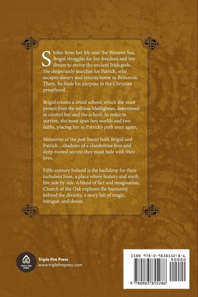 Stolen from her life near the Western Sea, Brigid struggles for her freedom and her dream to revive the ancient Irish gods. She desperately searches for Patrick, who escapes slavery and returns home to Britannia. There, he finds his purpose in the Christian priesthood. Brigid creates a druid school, which she must protect from the ruthless Maithghean, still determined to control her and school. In order to survive, she must span two worlds and two faiths, undertakings that place her in Patrick's path once again. Memories of the past haunt both Brigid and Patrick...shadows of a clandestine love and deep-rooted secrets they must hide with their lives. Fifth-century Ireland is the backdrop for their turbulent lives, a place where history and myth live side by side. A blend of fact and imagination, Church of the Oak explores the humanity behind the divinity, a story full of magic, intrigue, and desire.